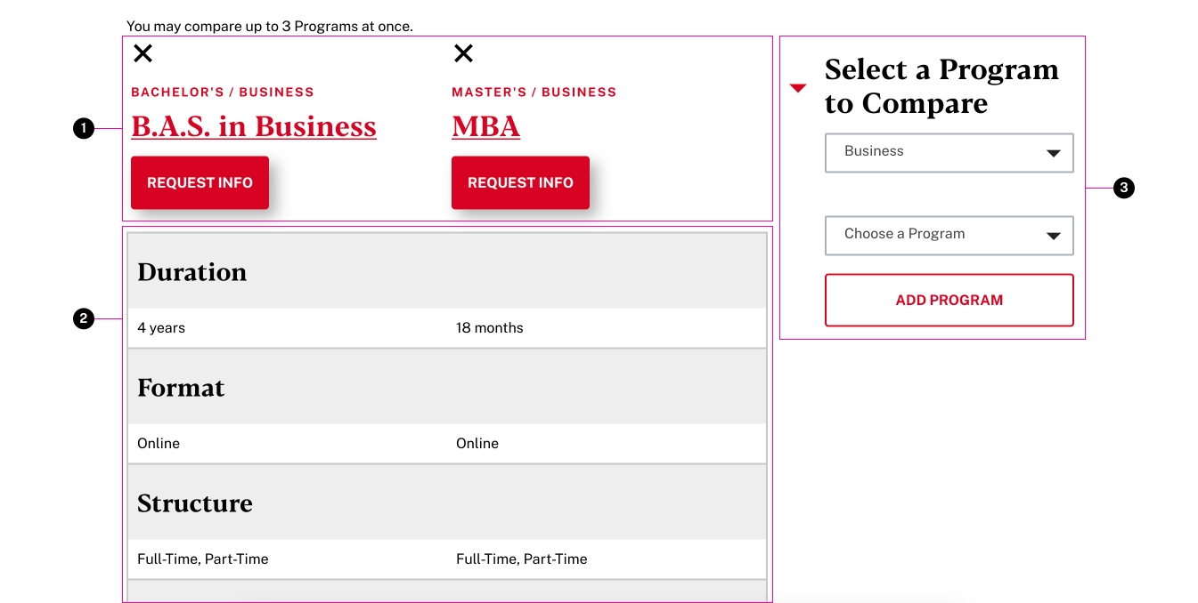 A maximum of 3 programs may be selected to compare, and only 2 are shown on mobile.